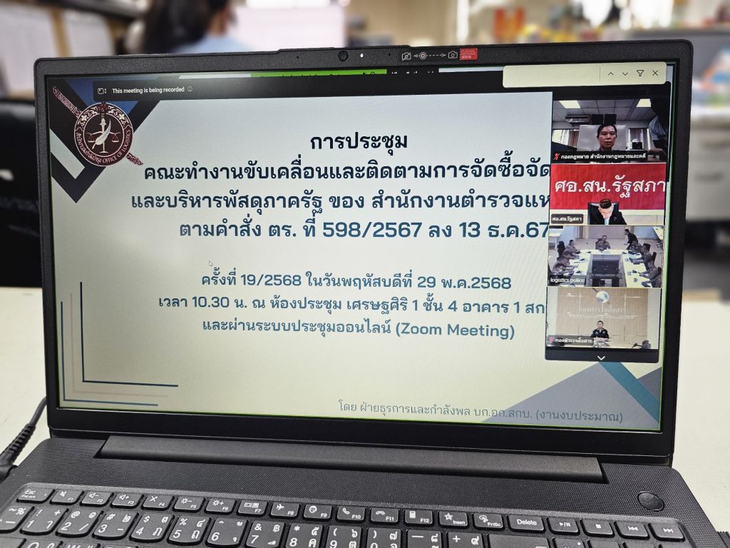 วันนี้(29 พ.ค.68) เวลา 10.30 น. พ.ต.อ.หญิง ยุพดี โถน้อย รอง ผบก.กม. เข้าร่วมประชุม คณะทำงานขับเคลื่อนและติดตามการจัดซื้อจัดจ้างและบริหารพัสดุภาครัฐ ของสำนักงานตำรวจแห่งชาติ ครั้งที่ 19/2568 ผ่านระบบการประชุมทางไกลผ่านจอภาพ (video Conference)โดยมี พล.ต.ท.กฤษฎา สุรเชษฐพงษ์ ผู้ช่วย ผบ.ตร. (บร. 4) เป็นประธานในการประชุมในครั้งนี้